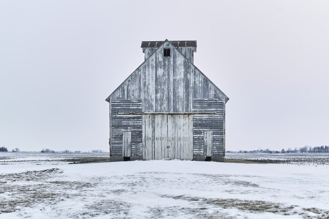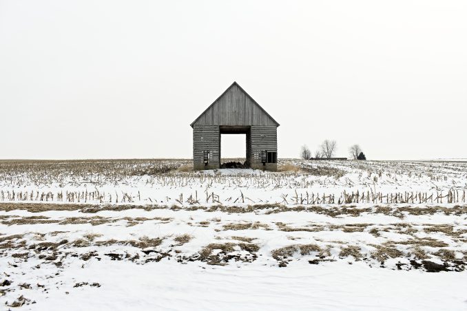 Open barn, snowy field, Midwest