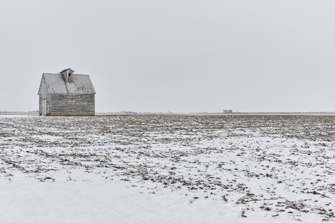 Barn in snowy field, Midwest