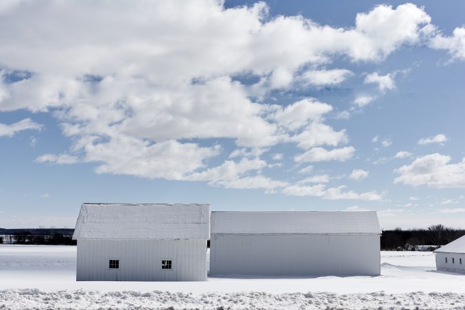 White barns, snowy landscape, Midwest