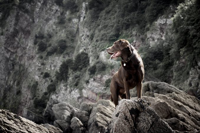 Devon, Labrador stands on rocks