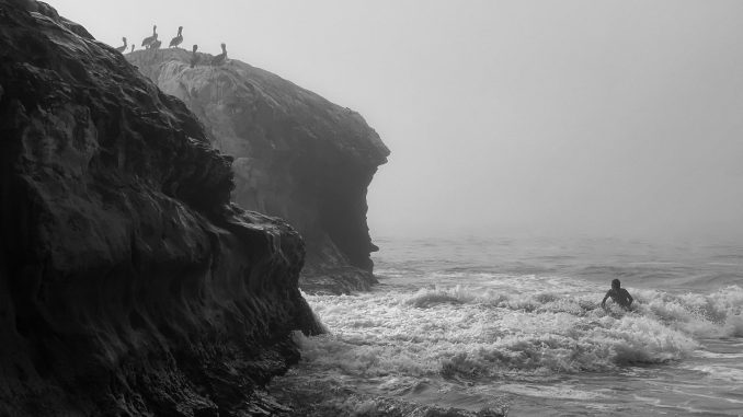 Surfer and Pelicans