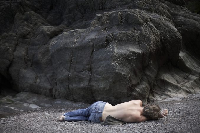 Boy asleep on shingle beach