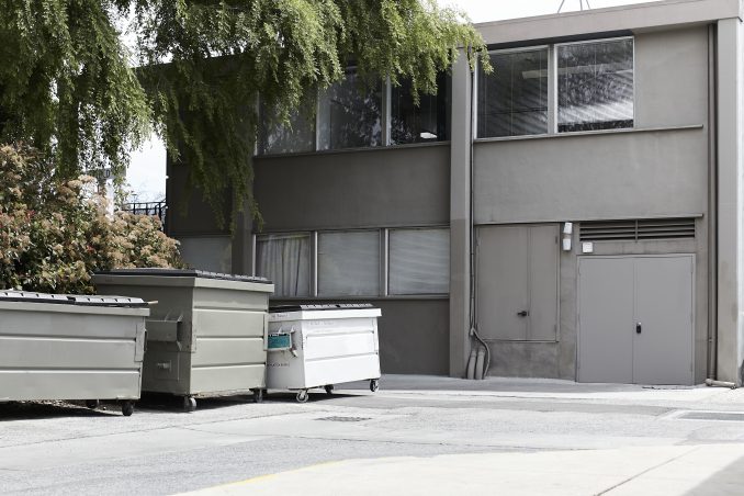 California, dumpsters and office building