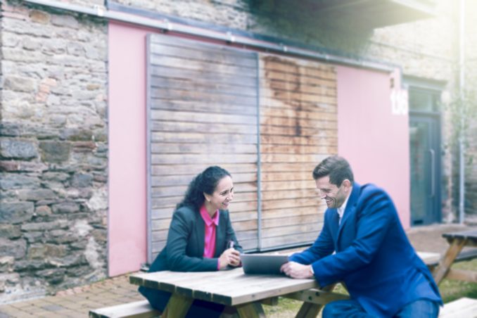 Two Businesspeople Sat On Picnic Table In Meeting