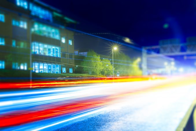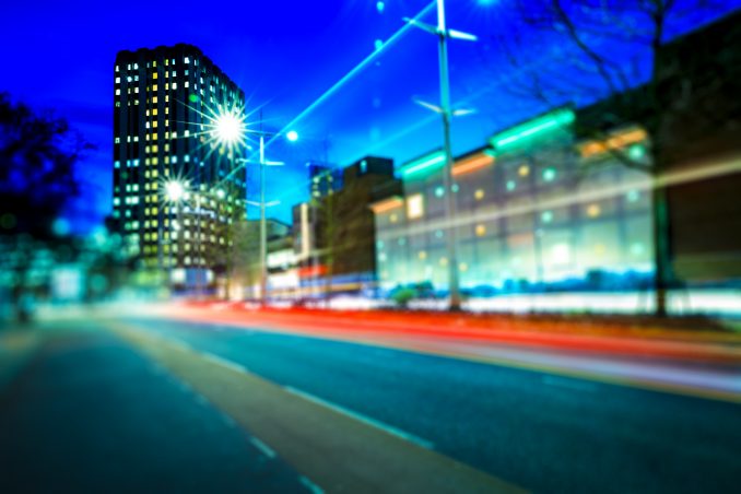 Busy City At Night With Office Block