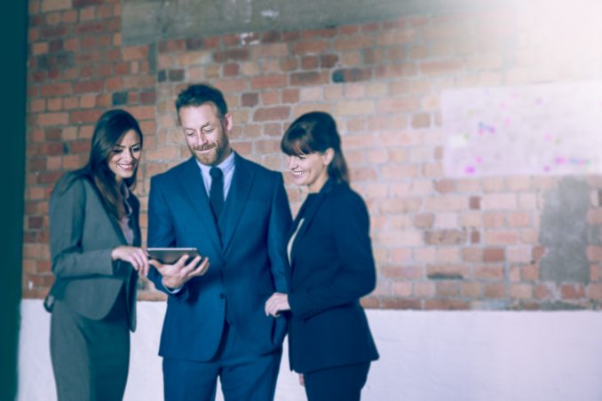Couple Stood Against Stone Office Wall Looking At Tablet