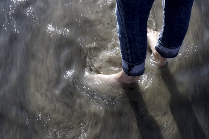 Woman stands in swirling sea